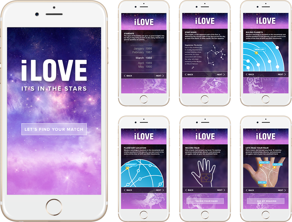 Concept and creation of dating app for Fox Mobile dating product. Take a photo of your palm to get a reading and find that perfect match.